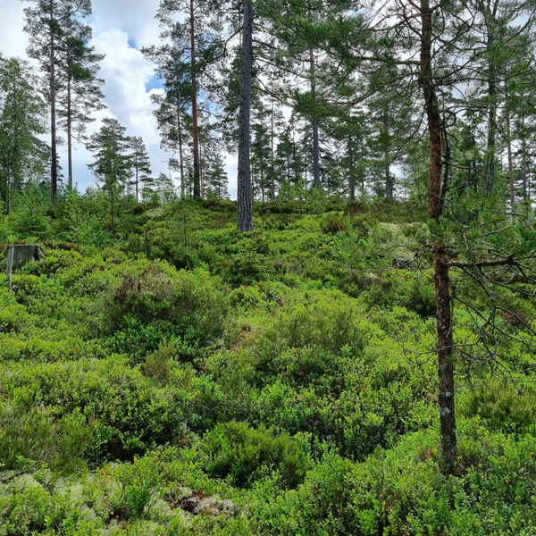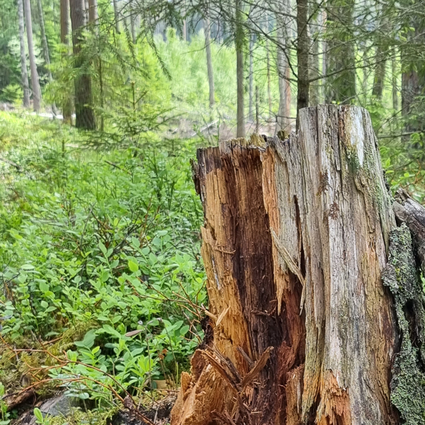 Turns off the road and goes north over a huddle. Come across a small path and follow it. A larger path joins from the left. Marshland. Dry and stony. A little further on you can see a large bog on the left. Passing a rough passage. In a while it’s going up a hill. On the left, a funny aspen root in one place. Further ahead, a rotten stump in an anthill. Took off the road when I noticed that it carried too much towards the north. Into the forest. Up and down, up and down, over marshland and morass, through sticks and thickets.
