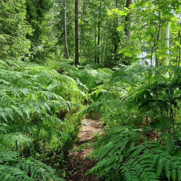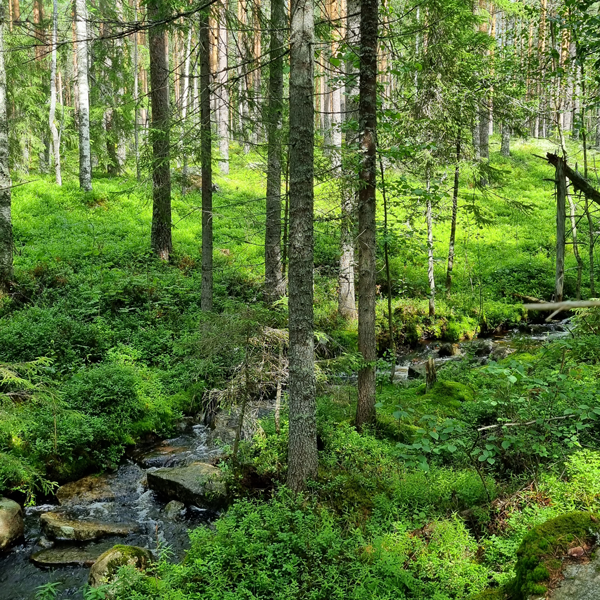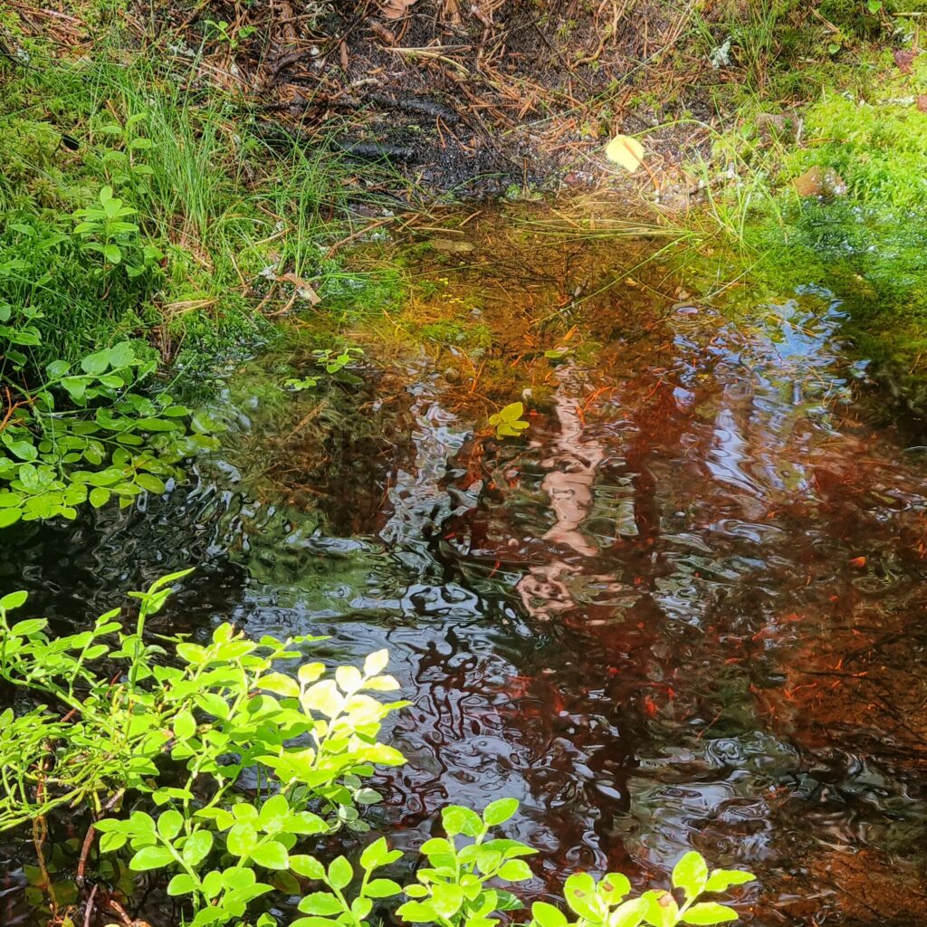 A bit up the hill there’s a property boundary. Under the nearest rock by the nearest pole or mark to the right is a message. I pass the creek further on. Then to the left (felled spruces, lie across the path), path narrowing. A good bit ahead is a pole to the right and a birch, from which a 25 cm piece of bark is torn off. Just beyond there the path crosses the creek. I walk across some small logs. A road meets from the left. There is a lot of dry horse manure in the road.