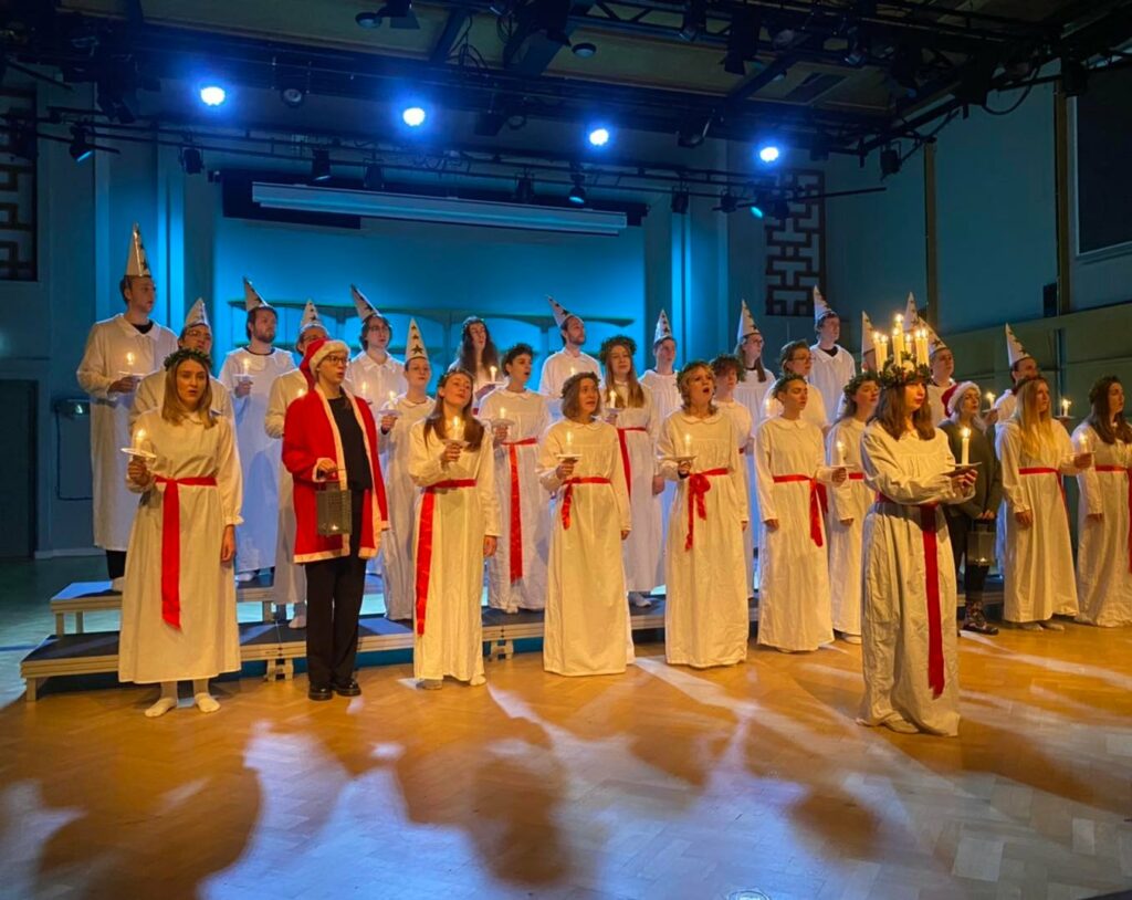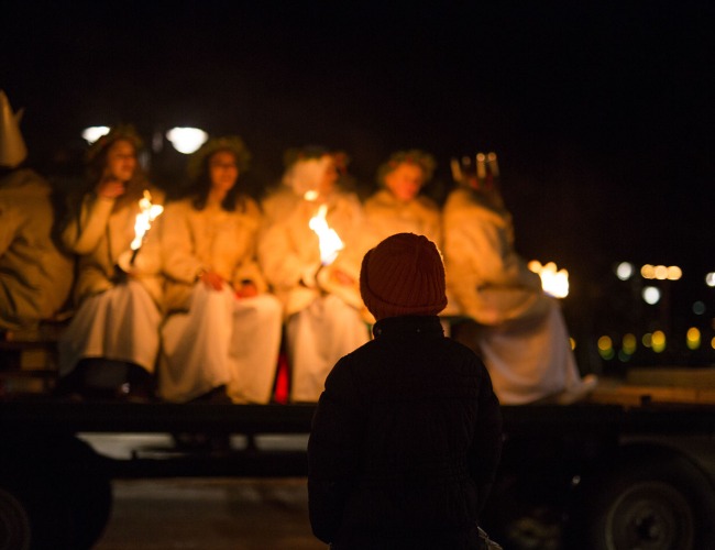 Enligt traditionen dyker Lucia upp före gryningen, men av praktiska skäl hålls många evenemang i skymningen och bli inte förvånad om svensken bredvid dig sjunger med – de flesta svenskar kan luciasången “Sankta Lucia” utantill.