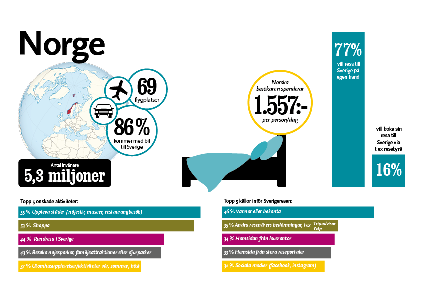 Norge är Värmlands största gästnattbesökare och statistiskt sett är juli den starkaste högsäsongsmånanden. Norrmännens val av boendeform är framförallt camping. Norge liknar Sverige när det kommer till val av betalningsalternativ, de betalar gärna och nästan helt uteslutande med sitt VISA-kort och Mastercard under sin semester. Vid sökning av information om ett resmål, turisttjänst eller biljettpris användes smartphone mest av målgruppen.