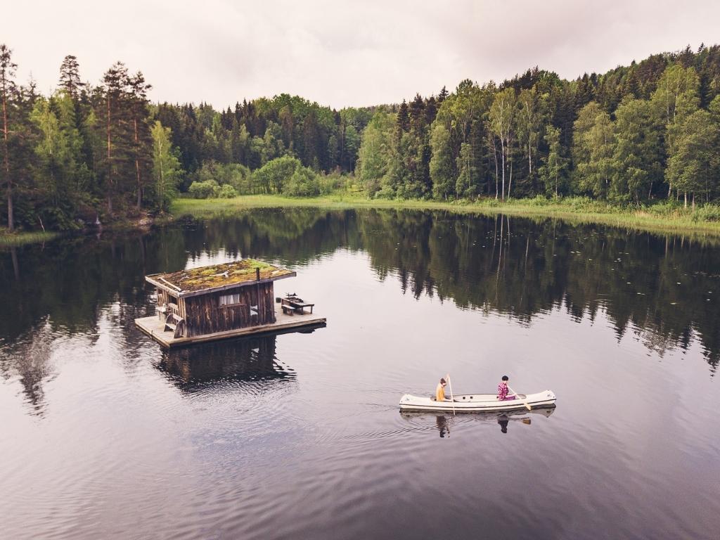 Här kan du bo i trädhus, husbåt eller i stuga utan vare sig rinnande vatten eller el. Laga mat över öppen eld, bada bastu för att sedan hoppa i den uppfriskande sjön efter ditt bad.
