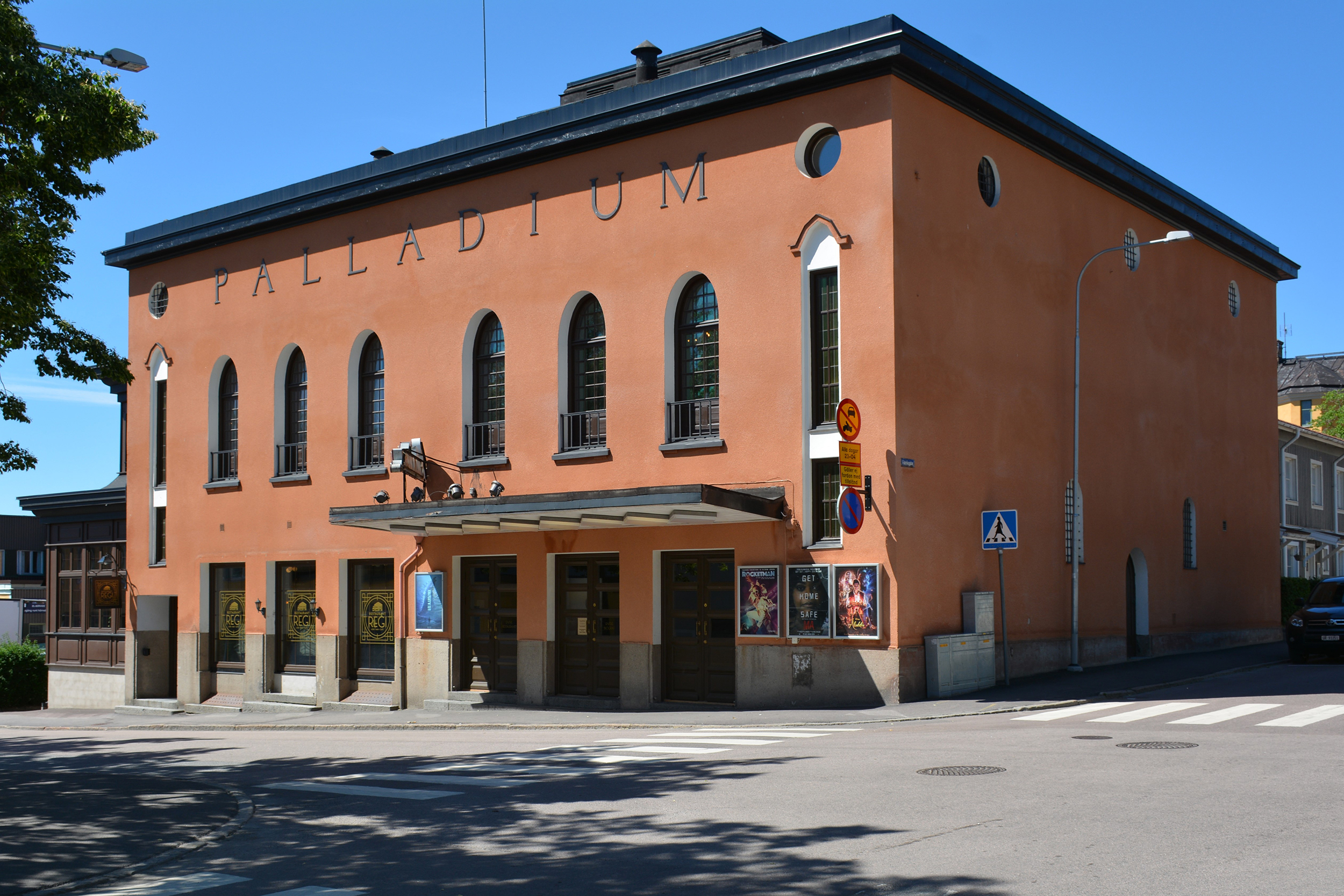 Palladium är nog bland de vackraste biopalatsen vi har i en svensk småstad. Fasaden som är putsad i rödockra är vackert komponerad med de höga välvda fönstren och de stora kopparbokstäverna som stoltserar PALLADIUM strax under plåttaket. Det är ett mycket fint exempel på den nordiska 1920-talsklassicismen som ibland kallas Swedish Grace.