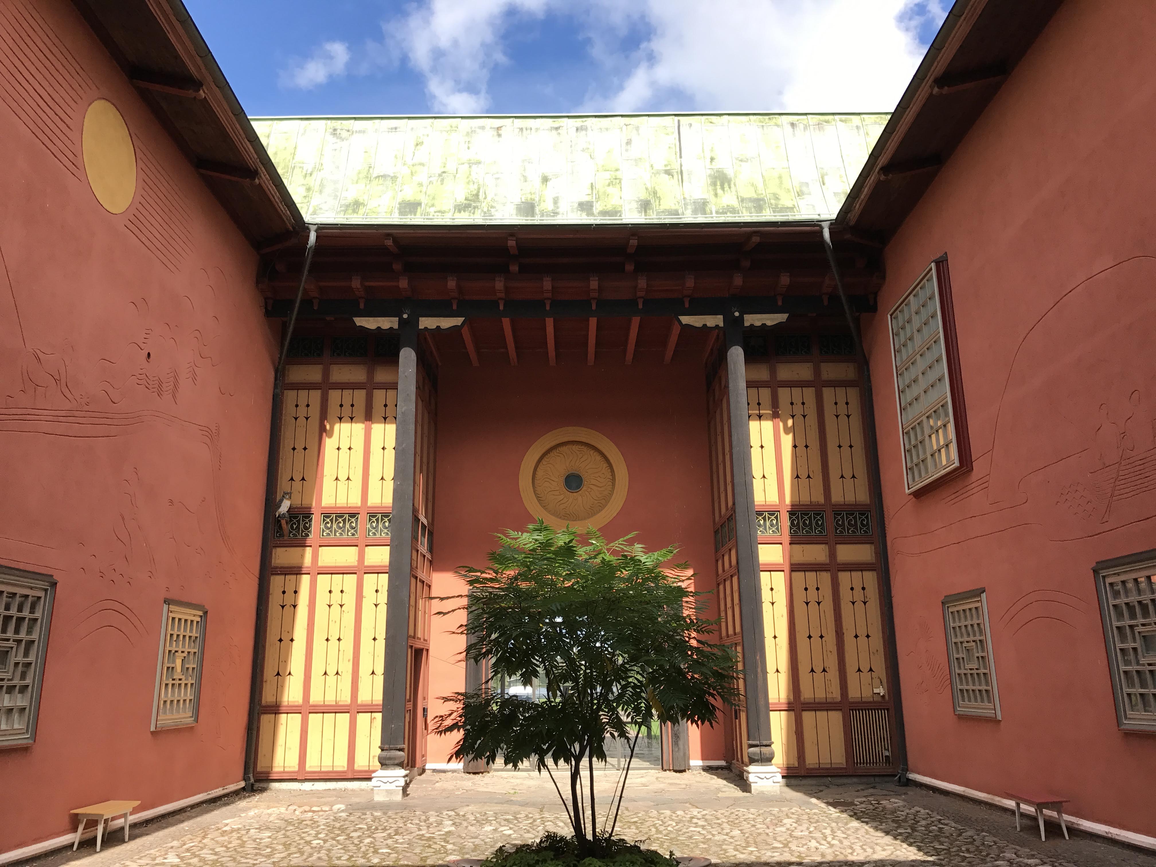 Även om både nationalromantiken och 1920-talsklassicismen är närvarande är även den traditionella kinesiska arkitekturen en tydlig inspirationskälla, som i det svängda taket med en värmlandsörn i varje hörn, de fantastiska mustiga färgsättningarna och de sinnrika fönstren som skapar en axel rakt genom den annars massiva byggnaden.